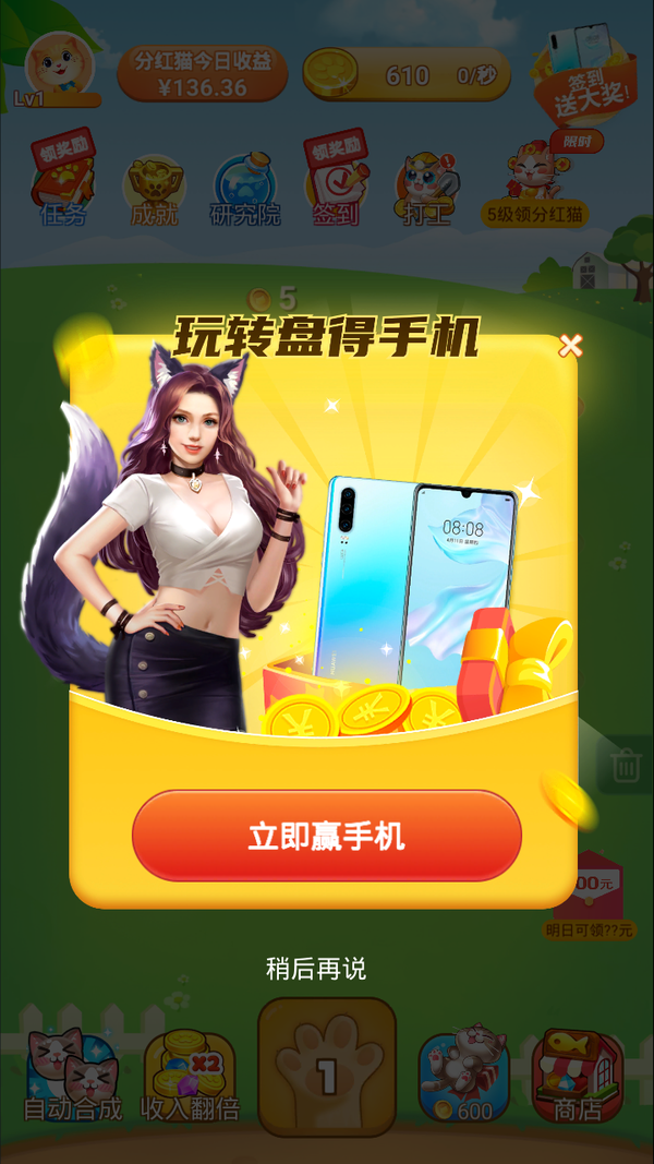 嗨喵喵红包版正版是一款抽手机抽手机碎片兑换手机的游戏,这里有海量的小猫咪等待玩家的收养,玩家需要将同一个等级小猫拖动到一起进行合成,合成之后的小猫就能升级,等级越高的小猫,能带玩家的收益就越多。