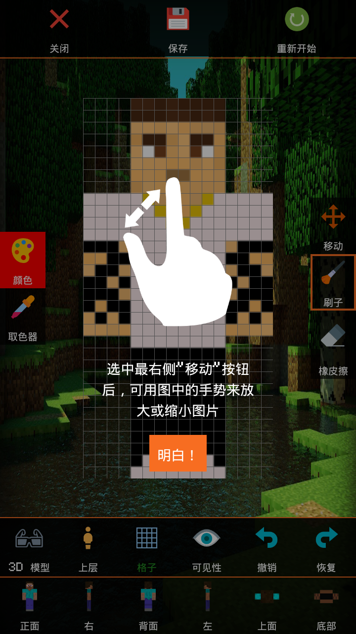本使用是一款像素图片修改东西,它能够使用户很方便地在手机上修改任何我的世界皮肤。本使用供给了皮肤修改和皮肤打扮两种功能,并且供给了大量的资料,方便用户的使用。本软件供给了许多东西供您使用,包含铅笔、色轮、色盘、橡皮擦、取色器、色盘等等,还能够进行3d预览,并且供给了6个方向的视图: 正视图、后视图、左视图、右视图、 顶视图、底部视图,方便您从各个方向进行对图片的修改。在皮肤打扮功能模块,用户能够很方便地用本软件供给的资料进行打扮,能够给皮肤更换肤色、帽子、眼镜、夹克、裤子等等。在用户修改完皮肤后,能够保存到相册中。