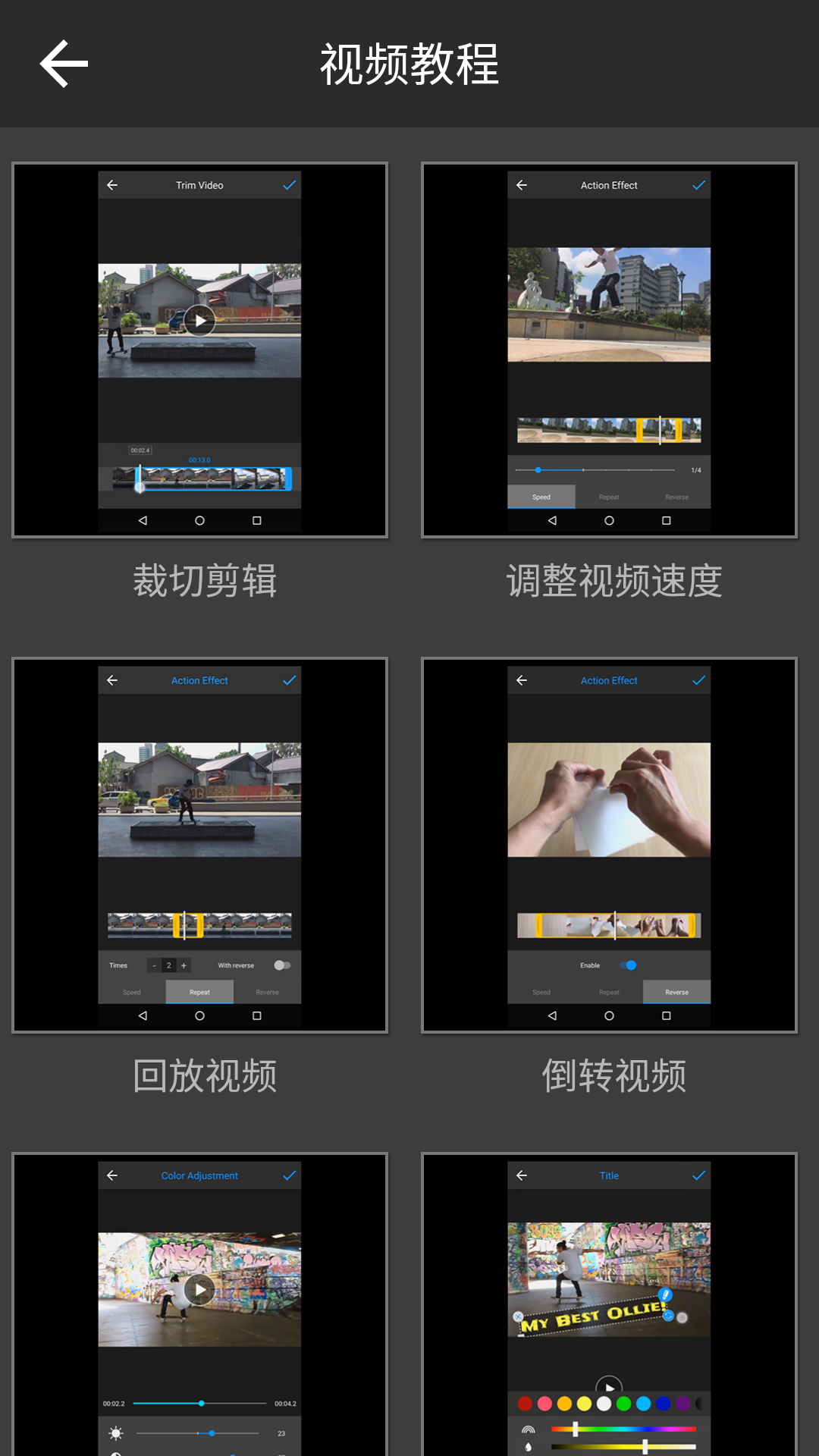 转倒放倒退视频:在视频编辑当中,视频的倒放是很重要的功能,也是比较有特色的。APP同样提供了这个功能,点击编辑主页,点击需要调整倒放的视频,然后点击动作这里。然后进入到动作效果界面,这里同样的给视频加入一个黄条,黄条就是选取需要倒放的范围,默认是整个视频倒放,拖动黄条两侧的按钮即可选取倒放的范围。然后点击底部倒转按钮,点击启用。点击视频中间的按钮可以对视频倒放进行预览。