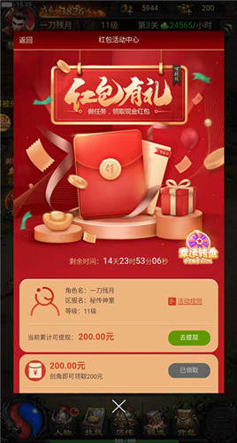 游戏中的红包福利都是在红包中心里面的,玩家下载红包版,注册账号进入游戏,完成新手引导,就可以看到红包中心,点击就可以进入啦,红包中心里面是很多的红包福利的,红包福利都是有一个任务的,就是需要玩家在规定的时间内到达一定的等级,最大的红包有500元和1000元的,小编可以跟负责任的告诉大家,这两个红包都是摆设的,就是好看而已,据小编所知,就没有人完成达到过的,就算达到了也不知道得充多少钱才有可能,所以玩家就不要想这两个红包啦,不过小的红包还是不难完成的,例如:18.88元红包,28.88等等的都是玩家可以完成的。