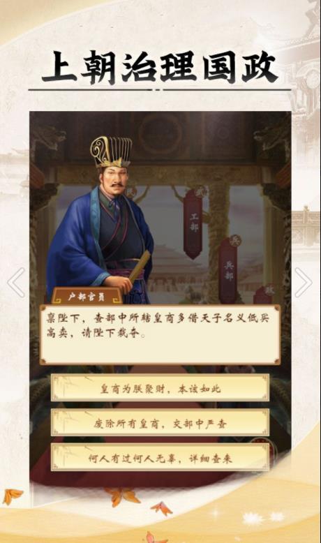在游戏中玩家将成为一位皇帝,玩家可以学着怎么治理国家,手握兵权,一清寰宇,保护国家不守外敌入侵。任命官员,给忠心有才能官员升官加爵,还可以选秀女,扩展后殿,孕育子嗣,是当昏君还是明君?感兴趣的小伙伴快来下载吧。