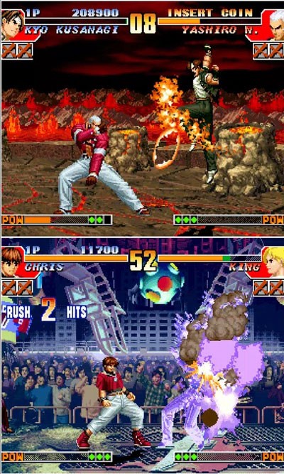 至于START,就是你投完币,屏幕出现“PRESS 1P OR 2P BUTTON”那个画面时,你按的那个,能见到火神和八神“表演”的键,至于两种模式,就是选人时ADVANCED和EXTRA之间的切换。