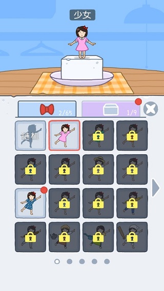 我们在游戏主界面点击屏幕左下方的衣服按钮,进入游戏的皮肤界面,可以看到其中分成女孩和豆腐两种,女孩部分是各种衣服,而豆腐部分则是各种不同的豆腐皮肤。
