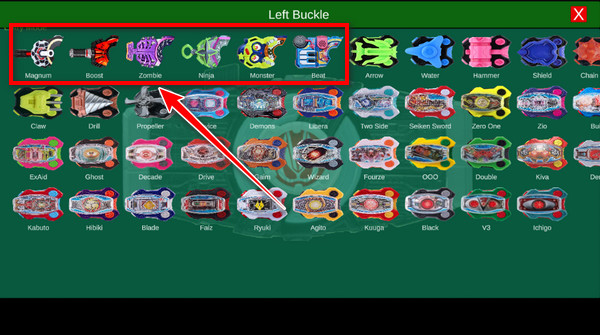 先设置左边,用户可以在打开的左边带扣设置页面中就可以选择一种款式了,其中出现的主要骑士带扣排在前面,除此以外还有假面骑士其他系列的联动音效带扣也在其中