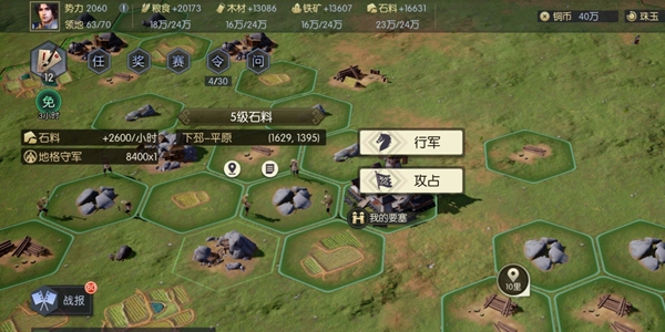 达到3级主城后,将令值达到18点,可以选择5星强力武将搭配主公,并升级裨将府开启军团第三位武将,搭配较低将令值的武将把军团凑满,如吕布、主公和一个校尉,可以刚好满编,使用原有的战技,可以攻占3级前的所有资源地,练度提高还也可以根据提示判断能否攻击4级地块。