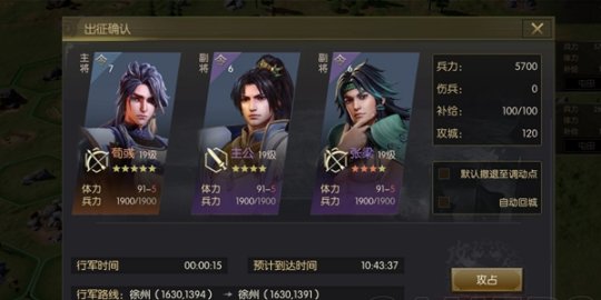 将令值为19点,可以选择搭配7+6+6或9+6+4等配置,此时需要的资源越来越多,低等级资源地也没有继续攻占的价值了,队伍养成可以准备向1名将+2上将发展,通过扫荡前期资源地,将武将等级提升到15-19级左右。