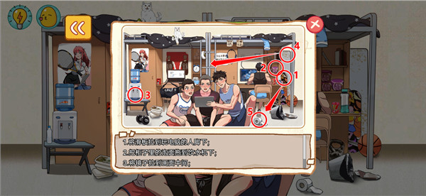 2、将潘周聃书桌右边的“老坛酸菜泡面”拖到左边的饮水机处接水,那位中间的男生将会去吃泡面。