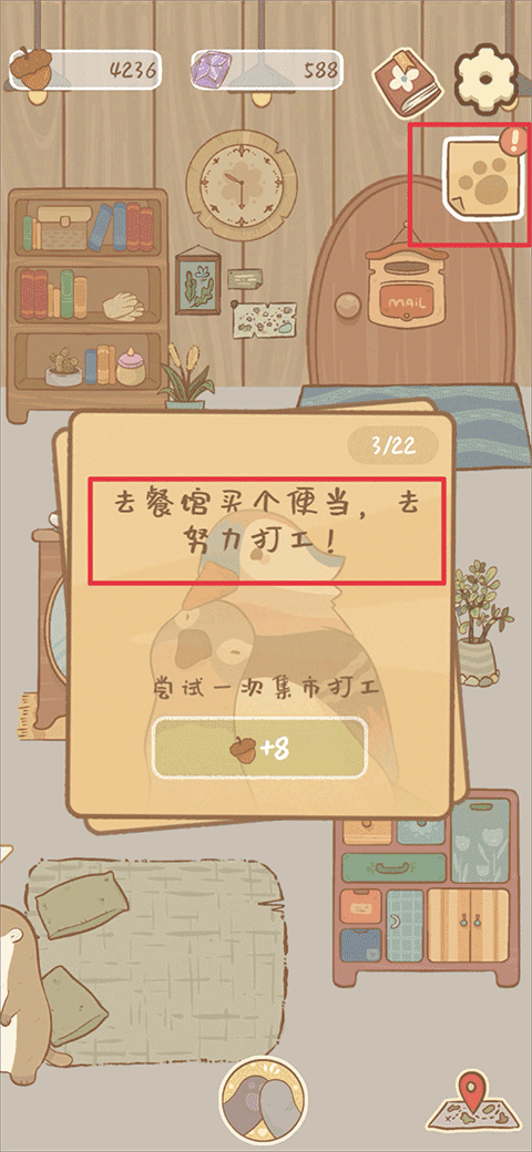 去餐馆买个便当,去努力打工这个任务完成后,点击右上角爪子图标也还可以领取任务完成的奖励,奖励领取完后即可开启下一个任务