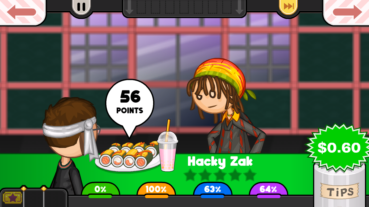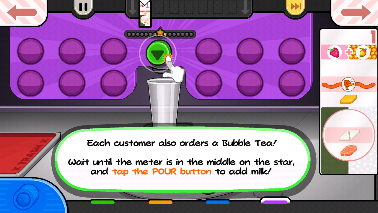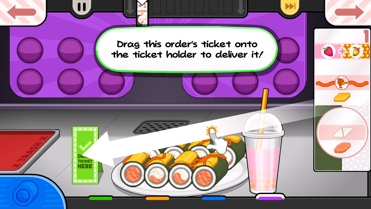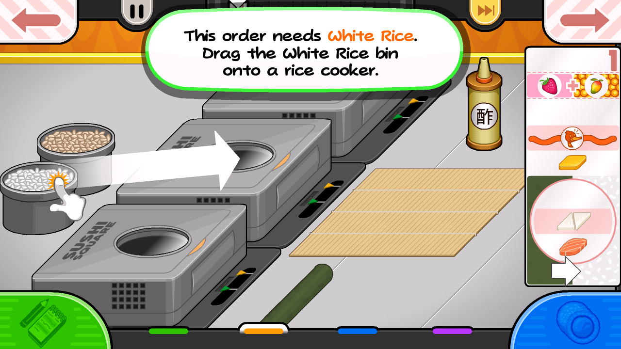这个顾客想要他的寿司卷,有鲑鱼和奶油芝士片,当你拖动一块一流的大米,你也会抓住一大堆配料,在每一堆配料量取决于 多少填料。然后,你将必须均匀地放置所有的碎片,然后移动到下一台。