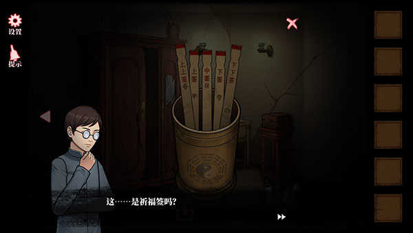 柜子上有个签盒,点击签盒盒身可以摇晃签盒,摇晃后会出现一张纸片,点击可获得。