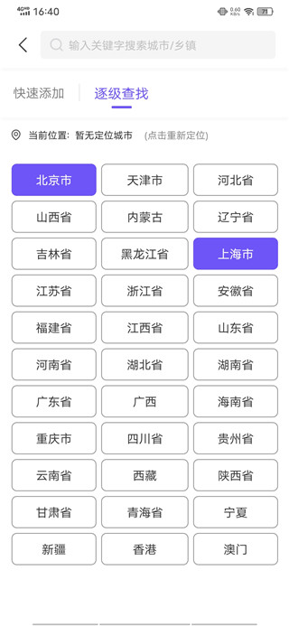 3、进入后用户可以选择打开定位功能,让app自动定位你所在的城市,也可以选择输入地区手动添加;