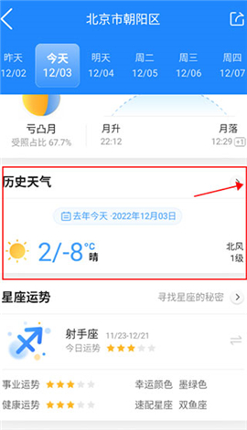2、向下滑动找到历史天气功能,进入后就能查看历史天气了。