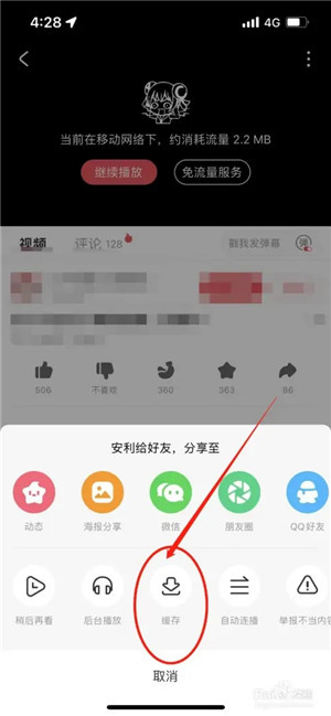 在视频菜单选项中点击缓存。
