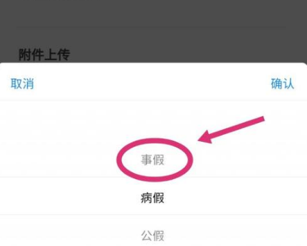第5步,我们需要选择请假类型,事假、病假、公假。我们选择完毕后点击确认。
