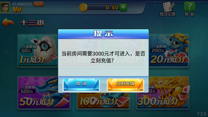 玩家进入到游戏之后选择【十三水】,一共拥有7个房间。