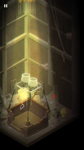 游戏的开始就是摩诺用门抵挡外面的攻击,第一关,摩诺在一个类似篮子的地方,需要按住上面的拉杆让自己落到地面上。