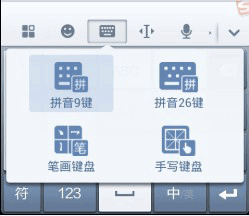 切换输入状态: 在顶部快捷工具栏点击左边第二个切换键盘按钮,即可进行输入法切换菜单,选择想要的输入方式和键盘样式:拼音9键、拼音26键、笔画和手写。