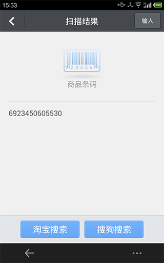扫描商品条码后,可进入网页搜索,也可以添加到输入框,还可以去搜狗搜索一下比价格: