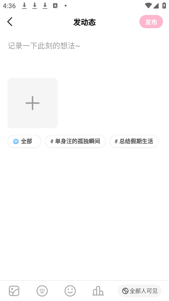 在编辑动态界面,输入文字内容,还可添加图片或视频素材。