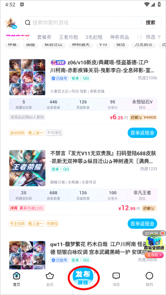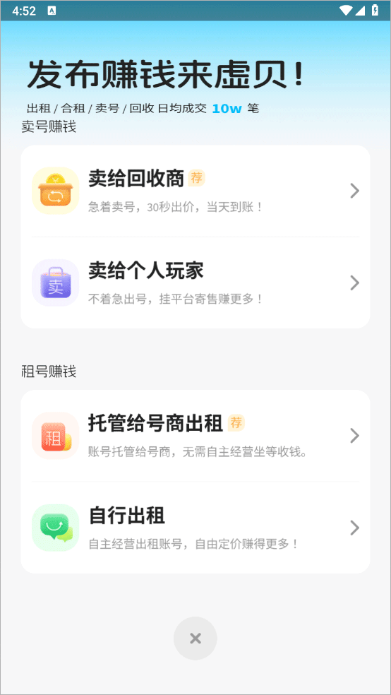 虚贝租号app是一款游戏辅助类型的软件,全方位满足不同玩家的个性化需求。 平台提供智能比价功能,让您轻松对比各账号参数,快速找到性价比最优的心仪之选。所有账号明码标价,价格透明公正。更有限时特惠活动,每日精选优质账号限时特价放送,助您以超值价格畅享高端游戏体验。