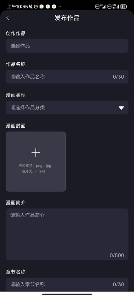 输入作品名称、漫画类型、漫画封面、简介等相关信息。