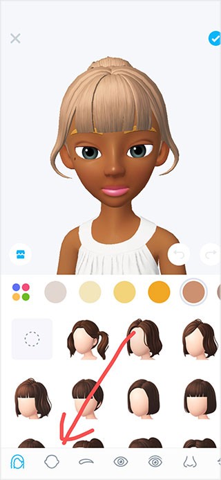 在脸型编辑中,有一排不同颜色的圆形图标,这个图标就是崽崽的肤色图标,从左往右肤色是由浅到深,如果喜欢白皙皮肤的小伙伴就选左边最白的就OK了;