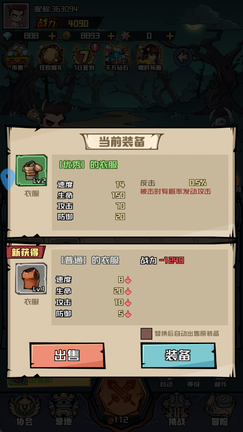 每次击败敌人都有几率掉落装备,界面上绿色箭头代表装备等级更高,可直接替换;红色箭头则为低级装备,建议出售换取金币。