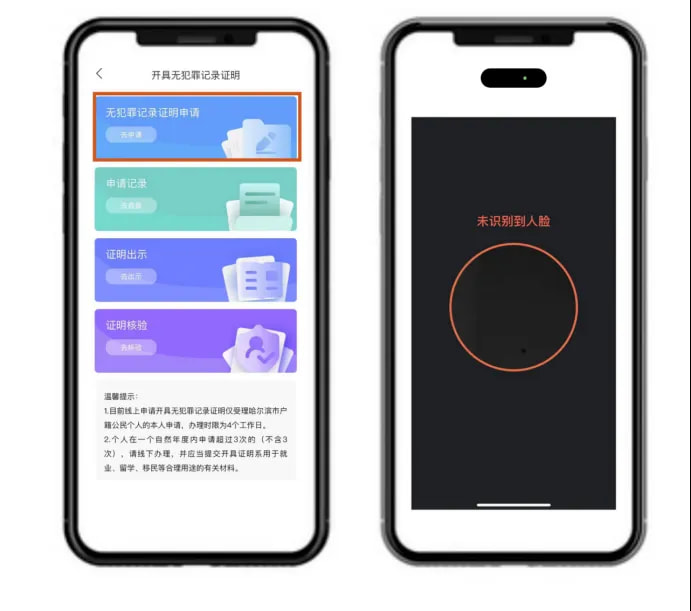 在“上新服务”栏目中选择“无犯罪记录证明”开始申请,进行人脸识别。
