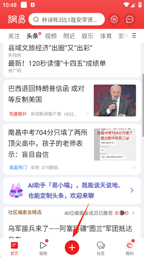 打开网易新闻APP,点击屏幕正下方的+图标;