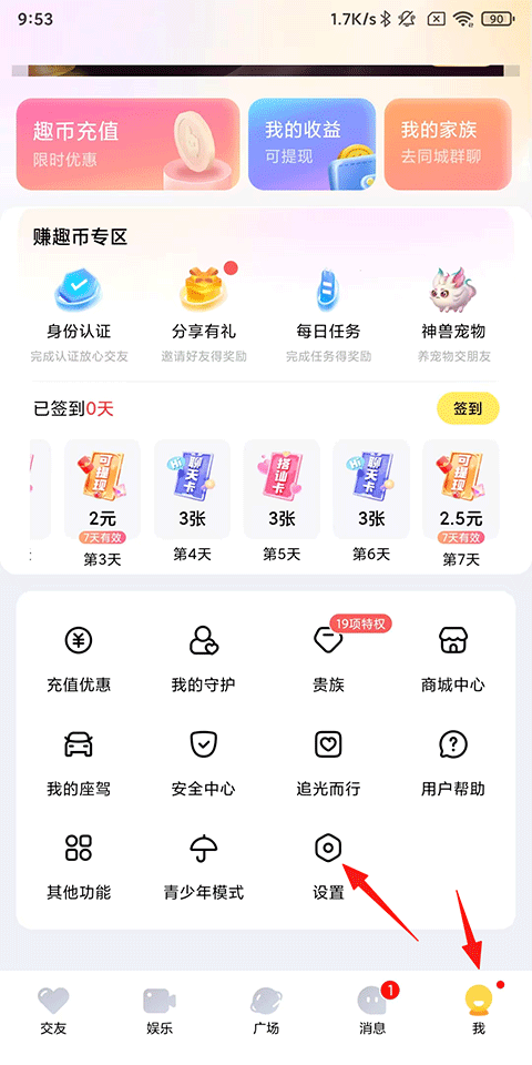 打开他趣APP,点击我的-设置;