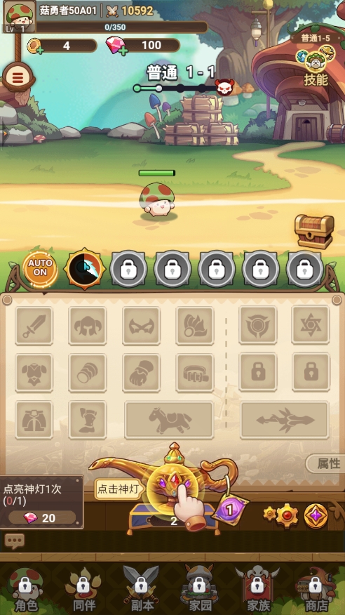 点击下方的【角色】,点击技能,可以对蘑菇进行一键装配或者一键强化。