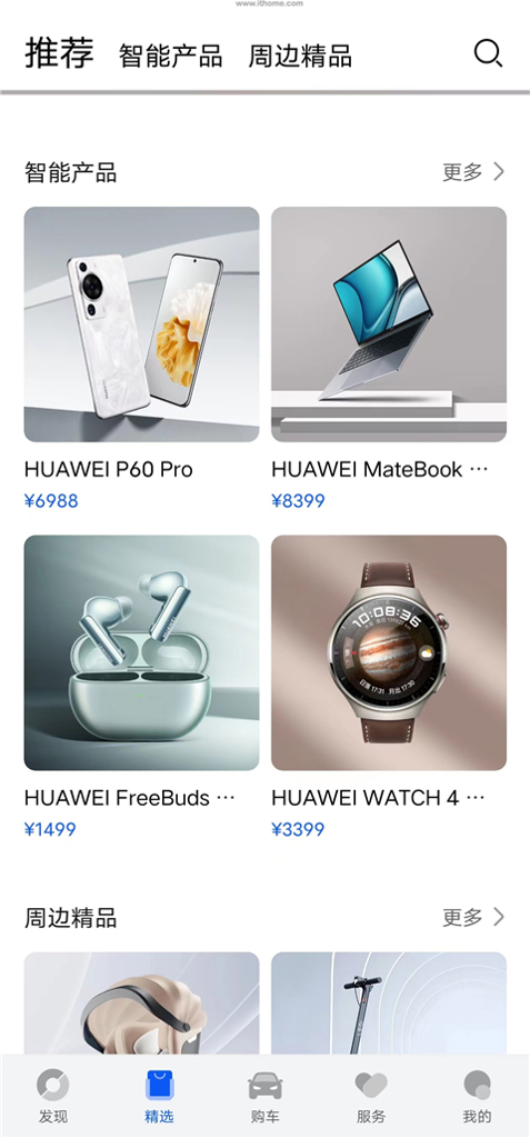 2、精选版块则为“购物频道”,可以购买华为旗下的各种产品,“周边精品”有四款智选产品;