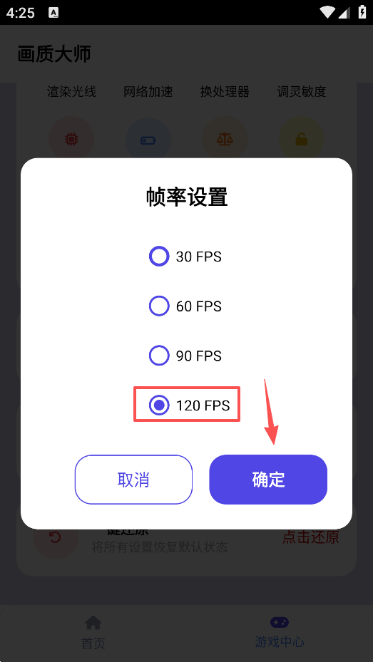 在打开的帧率设置页勾选【120FPS】,点击【确定】即可。