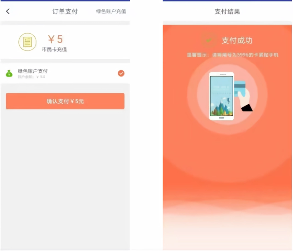 支付成功后,再次将卡片紧贴手机NFC天线处,不要移开卡片。充值完成会显示充值成功,请确认/查看充值金额及余额。