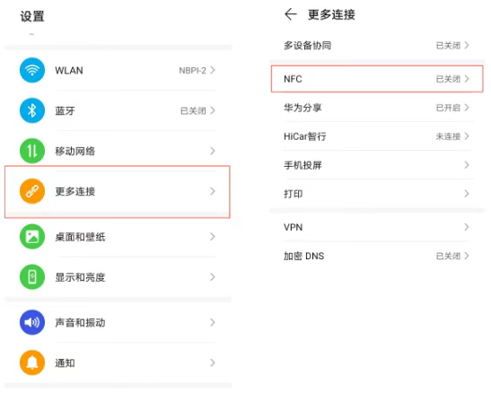 首先我们需准备一部支持NFC功能的安卓手机,将手机[设置]里的NFC开关打开。在手机设置-其他网络与连接或(更多连接方式)-NFC处打开NFC功能开关。
