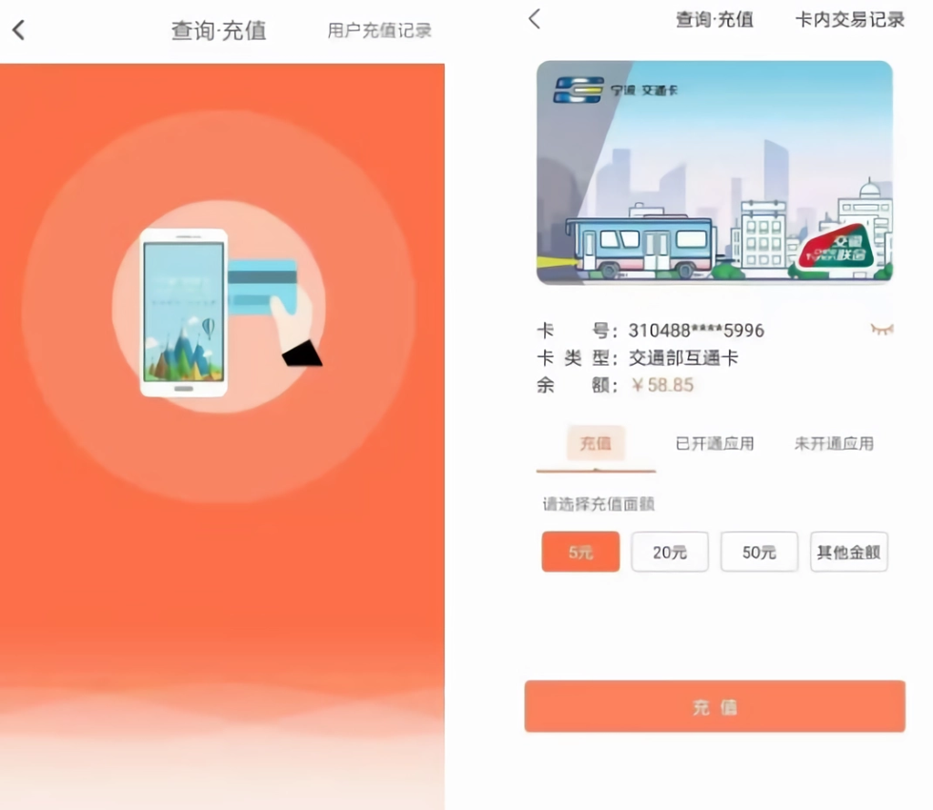 【查询•充值】提供基于NFC模块的实体卡贴卡充值、年审/充次。