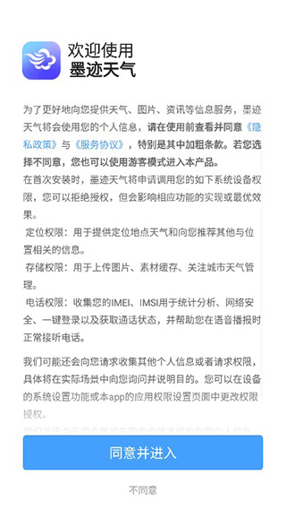 下载安装好本站提供的墨迹天气预报官方版软件,进入后先同意相关的协议;