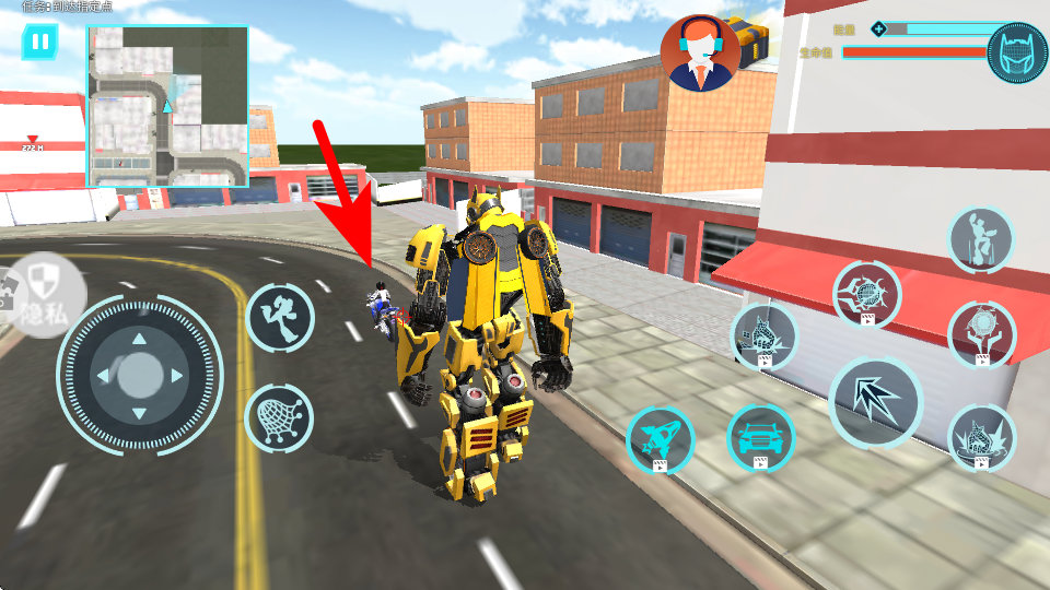 接近任务目标时,通过方向操控盘调整机甲站位,配合红色箭头指向的技能按钮发起攻击,推进流程。