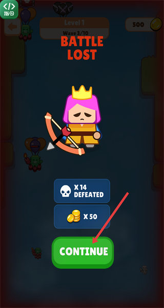 当战斗失败后,点击界面中的继续按钮,可结束当前失败的关卡流程,回到相关界面准备再次挑战。