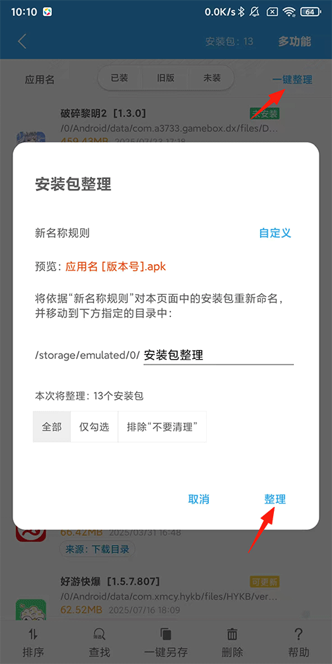 一键整理APK安装包:规范重命名,整理到统一目录中;