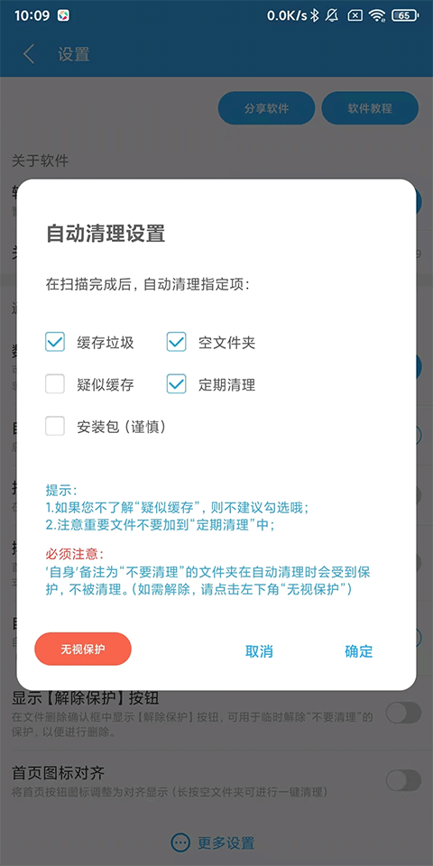 “扫描后自动清理”是项非常方便的功能,如果家中长辈不懂清理手机,只需打开此项设置(您也可以帮他选择好“定期清理”的文件,作为更深度的清理)。之后偶尔打开一次软件,就能自动完成清理了。