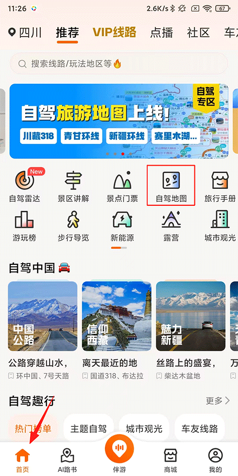 打开趣兜风APP,点击首页-自驾地图;