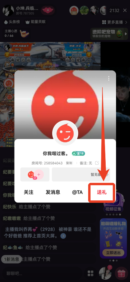 不仅可以给主播送礼物,我们也能给其他用户送礼物。点击公屏的名字。