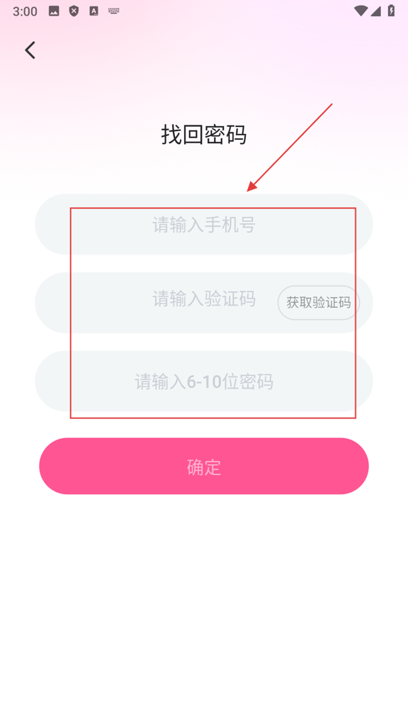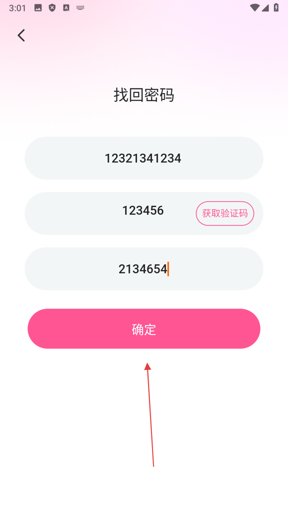 在找回密码页面,依次【输入手机号、验证码和新密码】,准备完成密码找回。