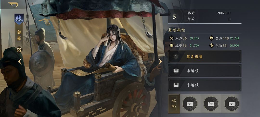 1、以曹操为核心的首选阵容是曹操+贾诩+郭嘉的魏国天灾队。