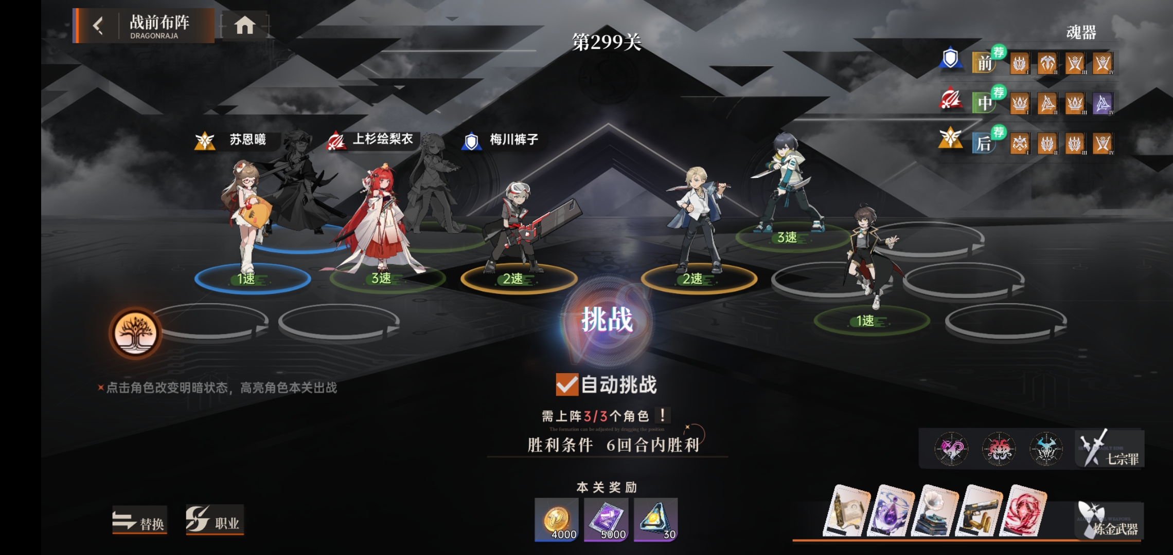 重点:装备培养。优主角三件,上杉生命,主C攻击。再到其余两人攻击。等于一共只用7件装备。