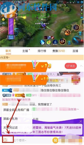 3.下一步就是需要找到手机界面左下角的五角星小图标了,点击这个小图标会出现一个功能界面,然后我们点击其中的屏蔽全部礼物和广播选项。