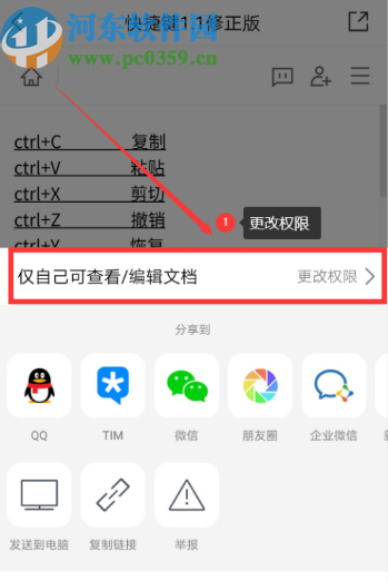 3.点击分享图标之后就会出现下图所示的界面,然后我们在界面中点击更改权限选项,如下图中所示。