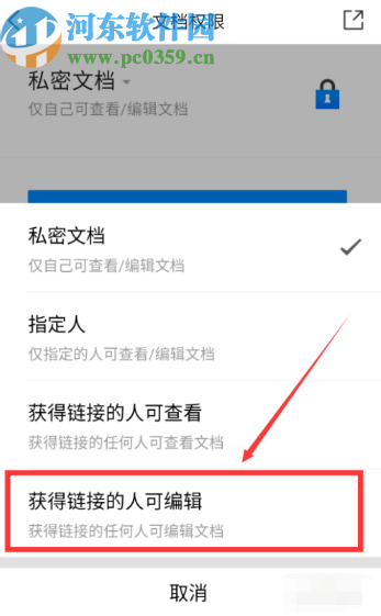 4.在设置更改权限的界面中我们选择最下方的“获得链接的人可编辑”这个选项,然后点击它。