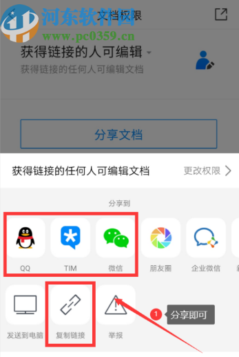 5.最后在获得链接的人可编辑的分享界面,我们选择将链接分享给QQ或者微信的好友即可,这样他们就可以共享这个文档了。
